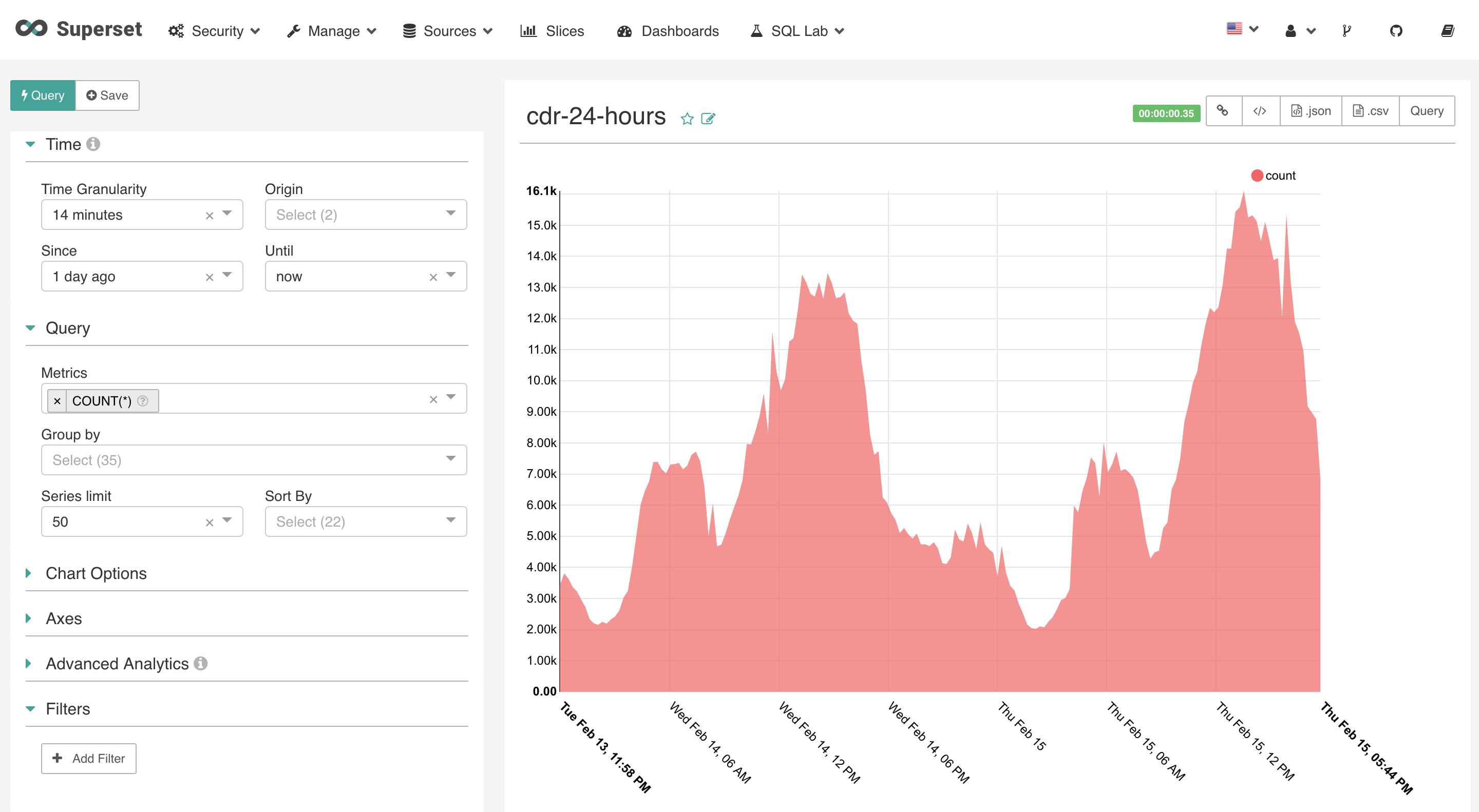Dans le cas présent, vous voyez un graphique qui compte de nombre de CDR ingéré par tranche de 24h. Vous pouvez adapter la durée qui vous intéresse mais aussi la granularité du graphique (nombre de points).